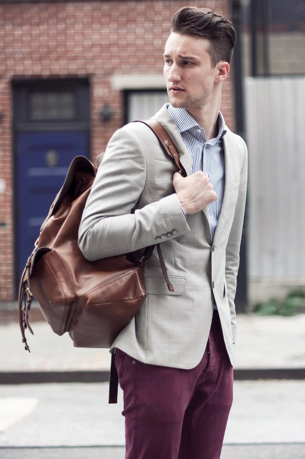 Back to school. It's FIT - Fashion Institute of Technology. Of course I got a haircut in the morning and dressed up. Whoops.. Oh well. I went with bordeaux-colored pants, a color which for me is always a little bit fall-y. Whenever I'm b-t-s I think it's fall and generally dress too hot. Anyway: paired that wit ha light blazer and cognac colored backpack and brogues. Happy first day of school.